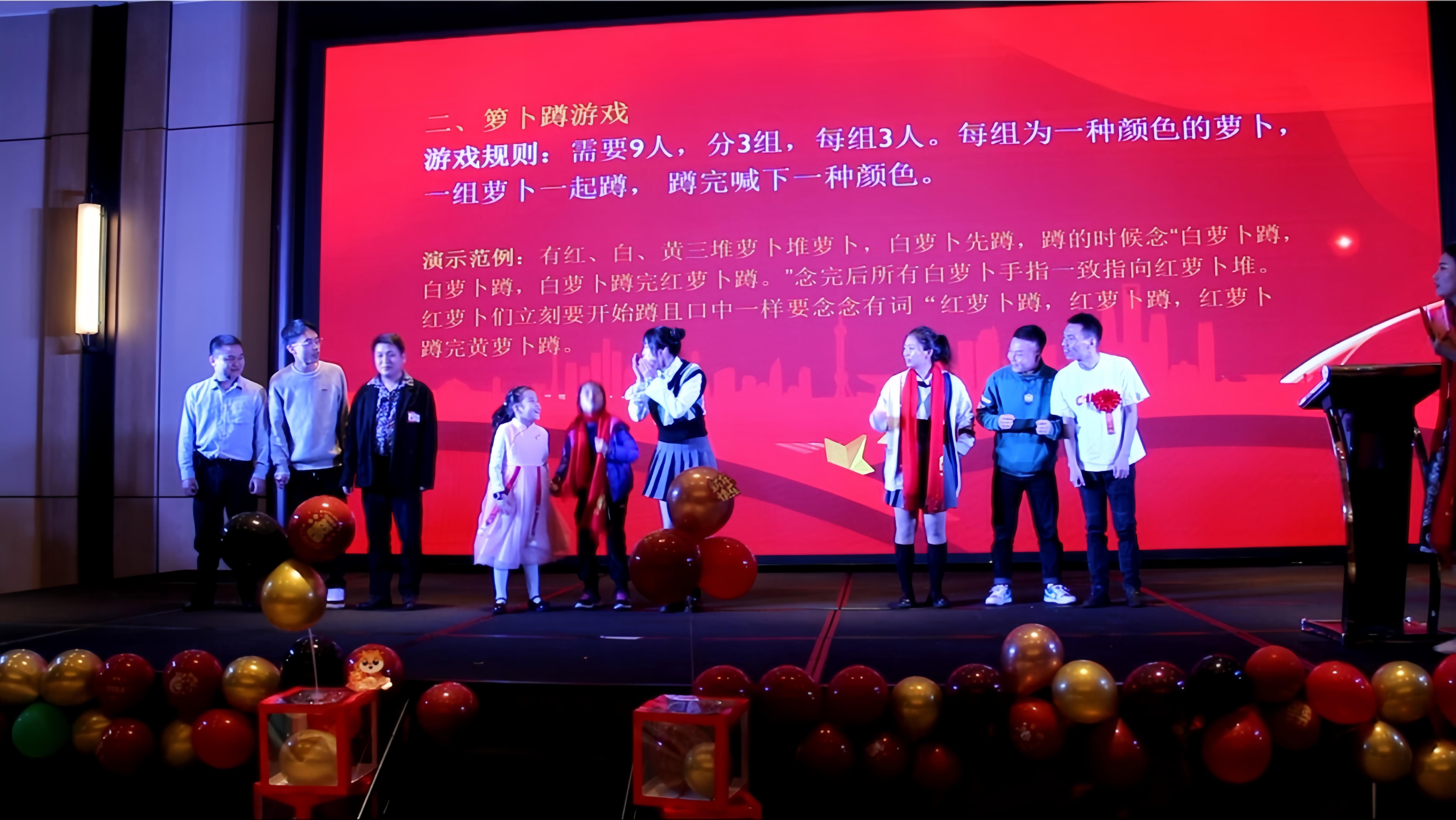 在年會的歡樂氛圍中,還有兩個(gè)充滿趣味性的游戲——搶凳子和蘿卜蹲。隨著歡快的音樂聲響起,搶凳子游戲正式開始,參與者們圍繞著凳子轉(zhuǎn)圈,眼睛緊盯著凳子,耳朵聆聽著主持的口令,當(dāng)音樂突然停止時(shí),他們需要迅速找到一個(gè)凳子坐下。一時(shí)間,現(xiàn)場充滿了歡笑聲和緊張的氣氛。緊接著是充滿趣味性的蘿卜蹲游戲,參與者們展現(xiàn)出活力的身姿。他們根據(jù)指定的口號,一蹦一跳地輪流蹲下起立,仿佛一群活潑的蘿卜在舞動(dòng)。在這個(gè)游戲中,不僅鍛煉了身體協(xié)調(diào)能力,還考驗(yàn)著團(tuán)隊(duì)之間的默契。