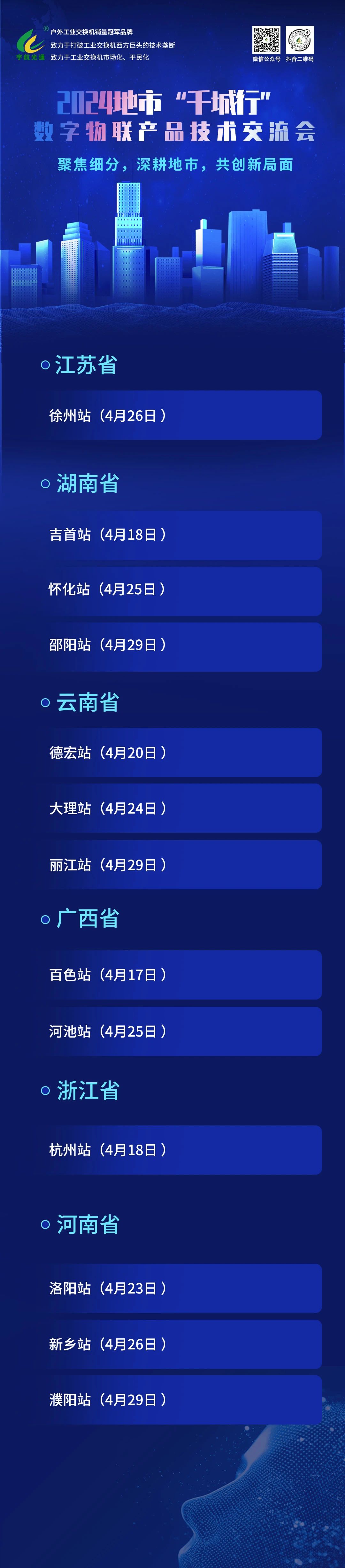 2024宇航工業(yè)交換機千城行產(chǎn)品技術(shù)交流大會正如火如荼地進行中,4月1日至4月16日,宇航分別在福建漳州、云南臨滄/保山、江蘇徐州、湖南張家界、河南開封等地成功舉辦大會。