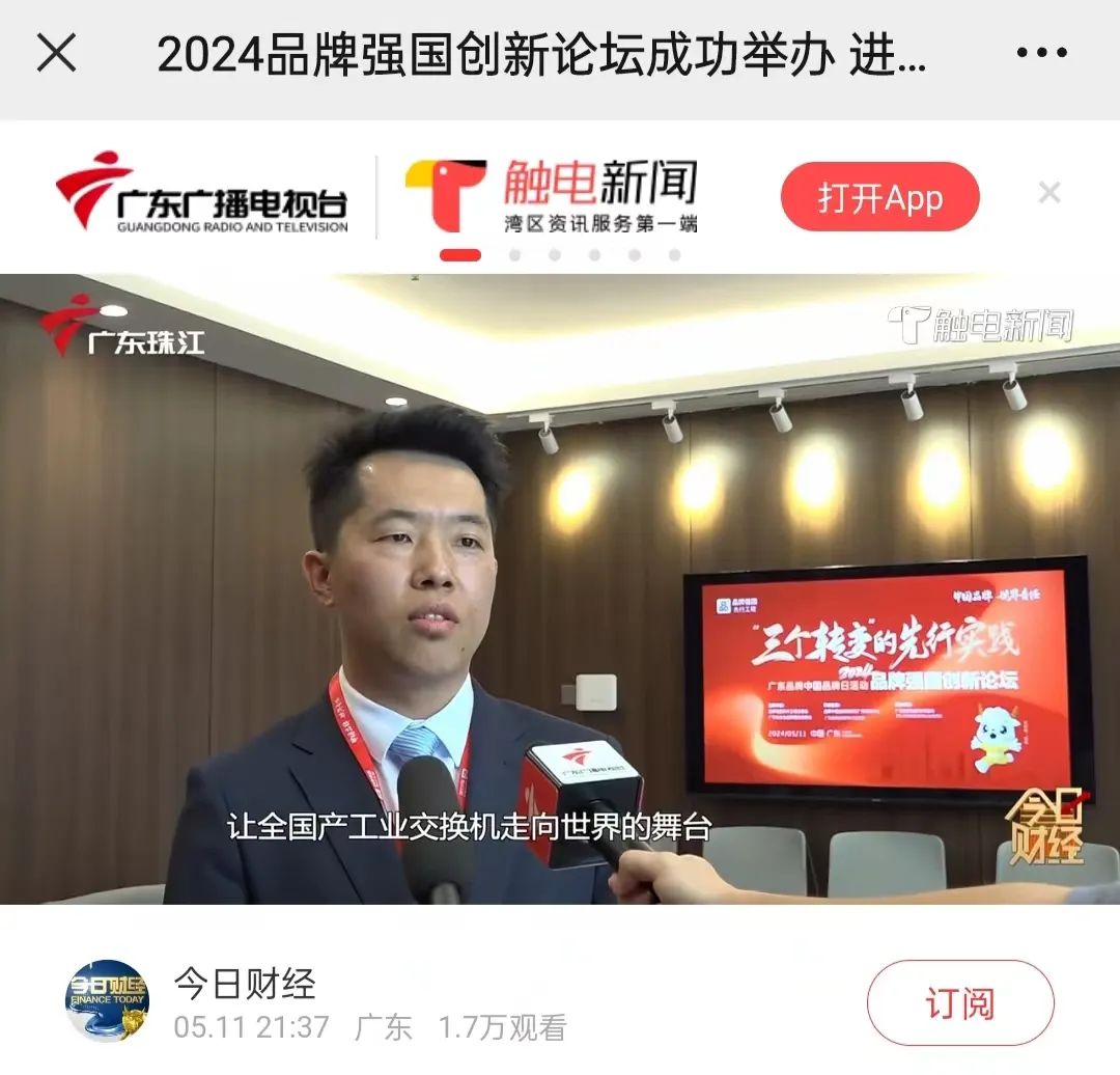 2024年5月10-11日,2024首屆品牌強國創新論壇,分別在廣東廣播電視臺南星演播廳和廣東品牌培育創新基地舉行開幕式和主題論壇,宇航工業交換機成功入選品牌強國先行工程“國貨之光”。
