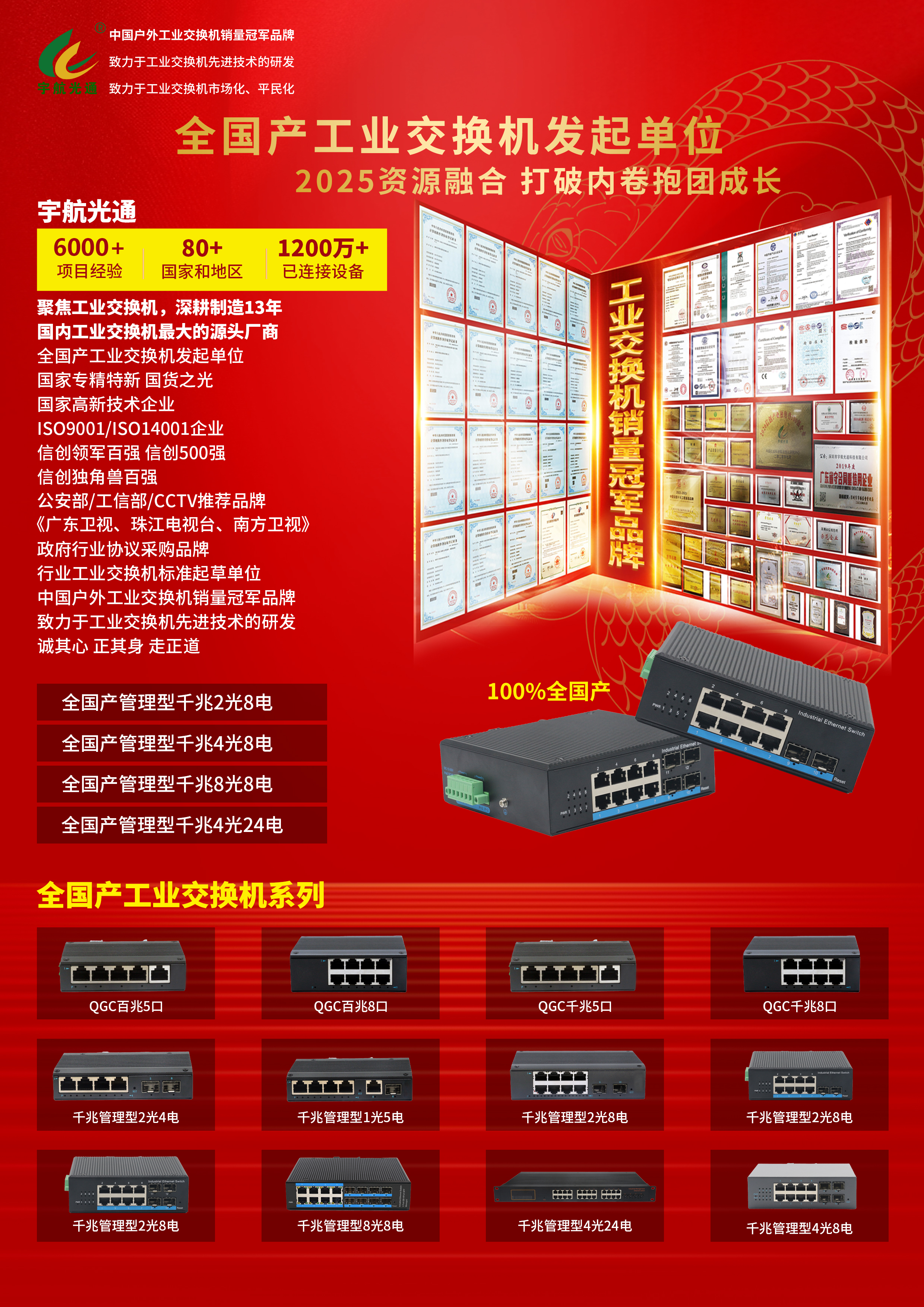 在信創產業蓬勃發展的背景下,宇航工業交換機連續四年榮登《中國信創產業500強》《信創領軍企業100強》《信創產業獨角獸100強》,并成為工信部、公安部智慧城市首推品牌。其全國產化交換機更獲央視、廣東衛視等權威媒體推薦,被譽為“國貨之光”。