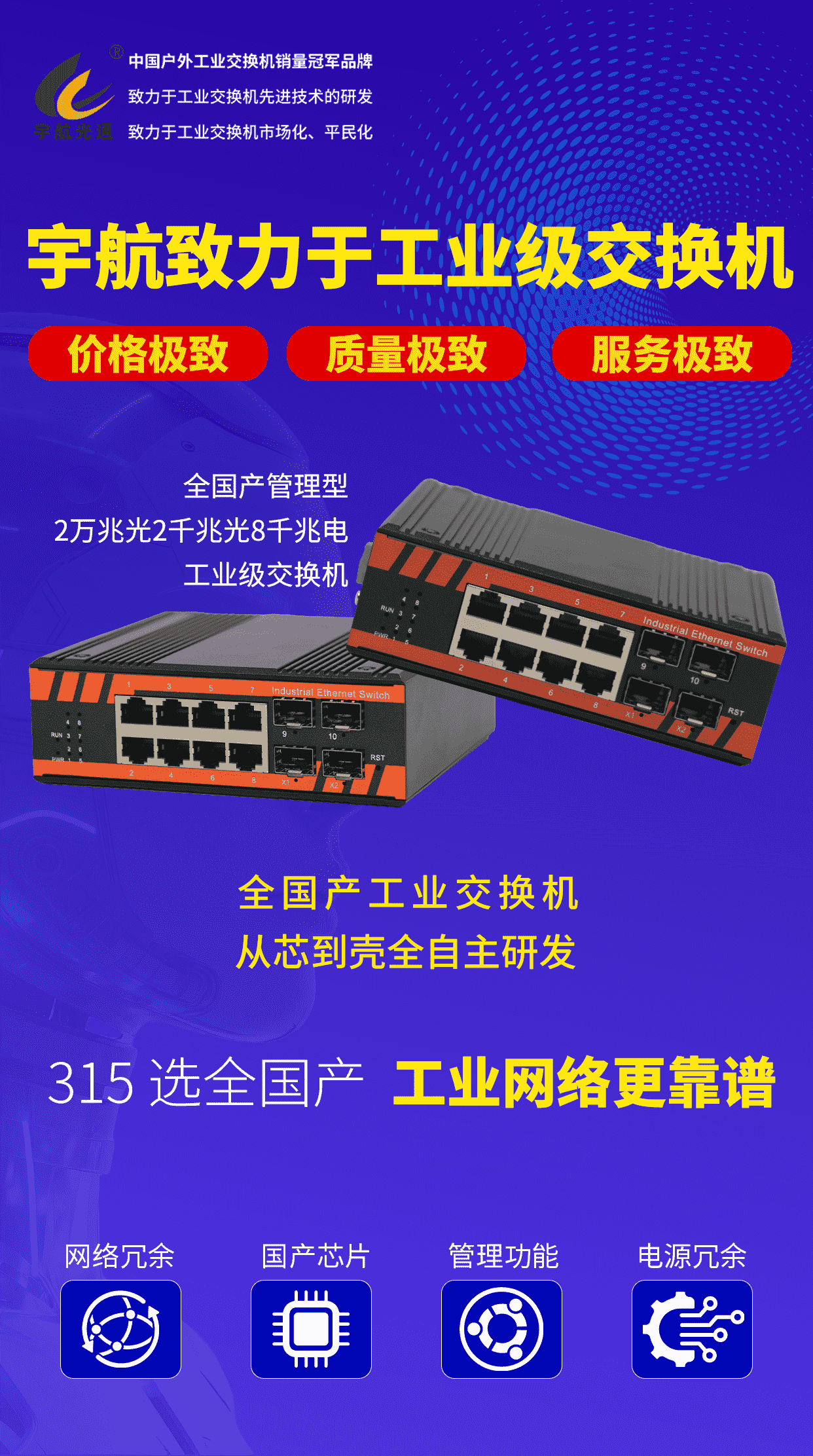 宇航工業交換機用14年時間持續證明:國產工業交換機同樣可以做到—“價格極致、質量極致、服務極致”。作為國產工業交換機最大的源頭廠商、全國產工業交換機發起單位和中國信創產業500強,宇航用"三個極致",向每一位消費者致敬!