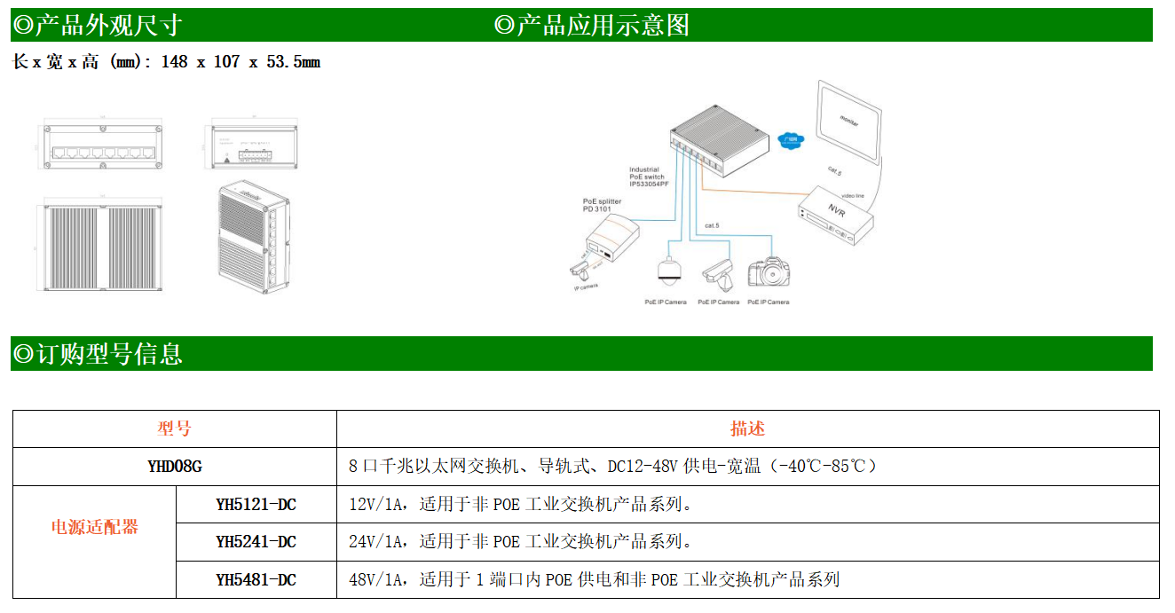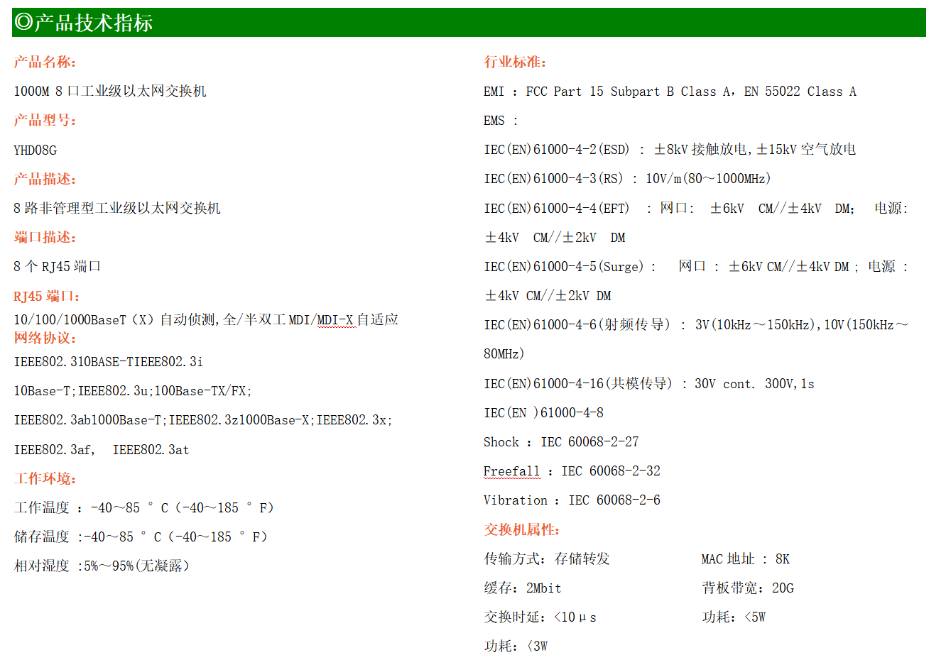 8路千兆電口工業(yè)級(jí)以太網(wǎng)交換機(jī),支持8個(gè)10Base-T/100Base-T/1000Base-TX電口。產(chǎn)品符合FCC、CE、ROHS標(biāo)準(zhǔn)。YHD08G交換機(jī)具有-40℃~85℃的工作溫度,具有超強(qiáng)的堅(jiān)固度能適應(yīng)各種嚴(yán)苛環(huán)境,也可以非常方便的安置在空間緊湊的控制箱中。導(dǎo)軌的安裝特性、寬溫操作及擁有IP40防護(hù)等級(jí)的外殼及LED指示燈,使YHD08G成為一個(gè)即插即用的工業(yè)級(jí)設(shè)備,為用戶的以太網(wǎng)設(shè)備聯(lián)網(wǎng)提供可靠、便捷的解決方案。