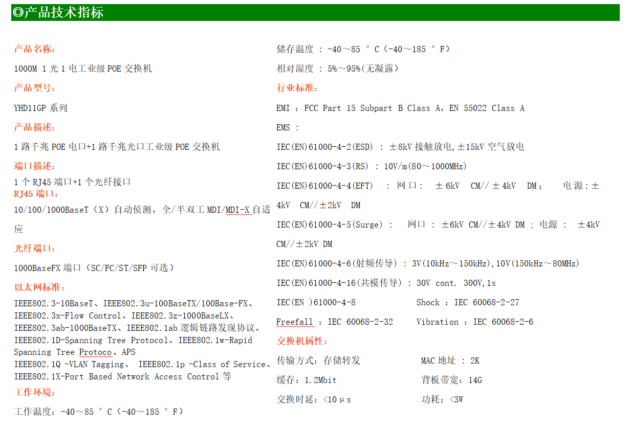 1路千兆POE電口+1路千兆FX光口工業(yè)級(jí)以太網(wǎng)POE交換機(jī),支持1個(gè)10/100Base-TX電口和1個(gè)100Base-X光口。產(chǎn)品符合FCC、CE、ROHS標(biāo)準(zhǔn)。YH300-11GP系列交換機(jī)具有-40℃~85℃的工作溫度,具有超強(qiáng)的堅(jiān)固度能適應(yīng)各種嚴(yán)苛環(huán)境,也可以非常方便的安置在空間緊湊的控制箱中。導(dǎo)軌的安裝特性、寬溫操作及擁有IP40防護(hù)等級(jí)的外殼及LED指示燈,使YH300-11GP成為一個(gè)即插即用的工業(yè)級(jí)設(shè)備,為用戶的以太網(wǎng)設(shè)備聯(lián)網(wǎng)提供可靠、便捷的解決方案。