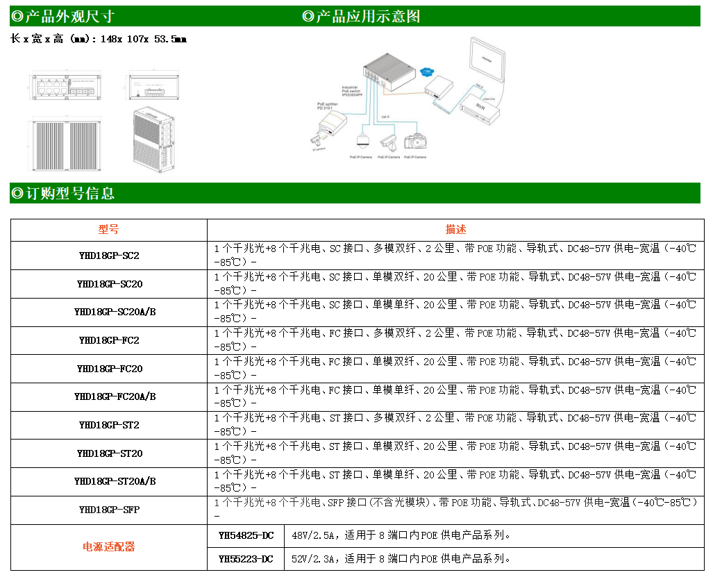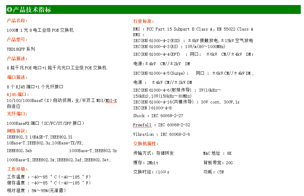 8路千兆POE電口+1路千兆FX光口工業級以太網POE交換機,支持8個10/100/1000Base-TX電口和1個1000Base-X光口。產品符合FCC、CE、ROHS標準。YH300-18GPP交換機具有-40℃~85℃的工作溫度,具有超強的堅固度能適應各種嚴苛環境,也可以非常方便的安置在空間緊湊的控制箱中。導軌的安裝特性、寬溫操作及擁有IP40防護等級的外殼及LED指示燈,使YH300-18GPP成為一個即插即用的工業級設備,為用戶的以太網設備聯網提供可靠、便捷的解決方案。