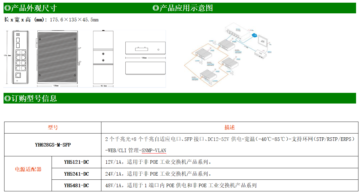 YHH600-28GS-M-SFP是網管型工業以太網交換機,產品符合FCC、CE、RoHS標準。支持2個千兆光口和8個千兆電口;支持工業現場所需的以太網二層協議,保證通信網絡的穩定性;該系列交換機采用低功耗、無風扇設計,確保無噪聲干擾,同時支持-40~85℃工作溫度和良好的EMC電磁兼容性能,保證在惡劣的工業環境中保持穩定的工作,為工廠自動化,智能交通,視頻監控等工業應用領域組建快速穩定的網絡終端接入網絡提供安全可靠的解決方案。