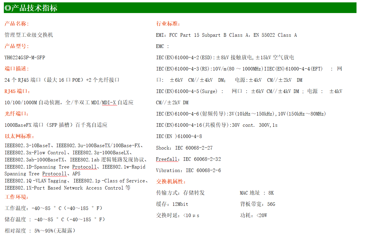 YH600-224GSP-M-SFP是網管型工業以太網交換機,產品符合FCC、CE、RoHS標準。支持2個千兆光口和24個千兆電口(最大16口POE);支持工業現場所需的以太網二層協議,保證通信網絡的穩定性;該系列交換機采用低功耗、無風扇設計,確保無噪聲干擾,同時支持-40~85℃工作溫度和良好的EMC電磁兼容性能,保證在惡劣的工業環境中保持穩定的工作,為工廠自動化,智能交通,視頻監控等工業應用領域組建快速穩定的網絡終端接入網絡提供安全可靠的解決方案。