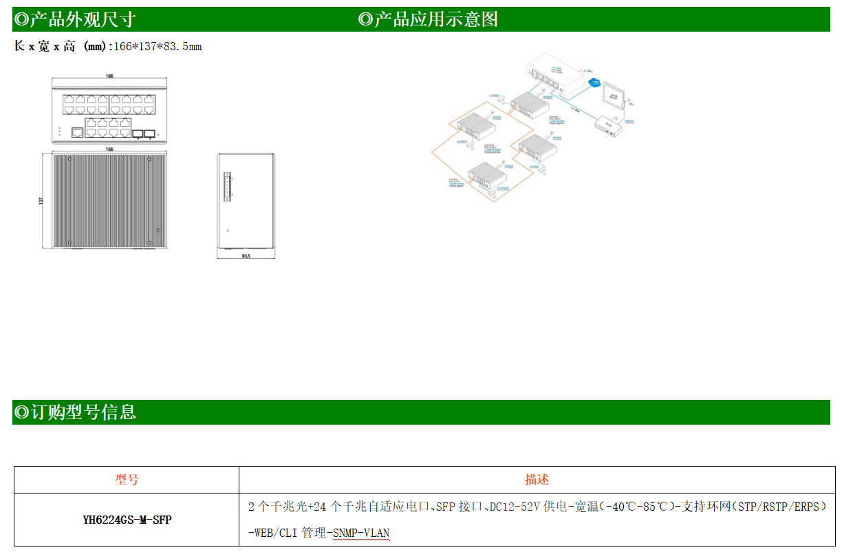 YH600-224GS-M-SFP是網管型工業以太網交換機,產品符合FCC、CE、RoHS標準。支持2個千兆光口和24個千兆電口;支持工業現場所需的以太網二層協議,保證通信網絡的穩定性;該系列交換機采用低功耗、無風扇設計,確保無噪聲干擾,同時支持-40~85℃工作溫度和良好的EMC電磁兼容性能,保證在惡劣的工業環境中保持穩定的工作,為工廠自動化,智能交通,視頻監控等工業應用領域組建快速穩定的網絡終端接入網絡提供安全可靠的解決方案。