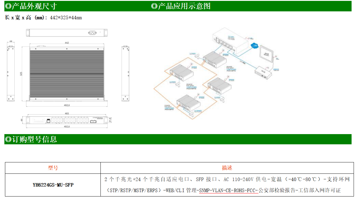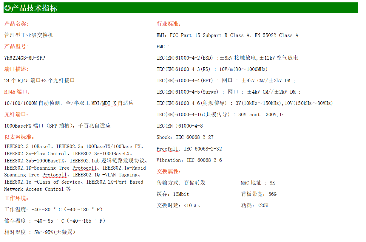 YH600-224GS-MU-SFP是網管型工業以太網交換機,產品符合FCC、CE、RoHS標準。支持2個千兆光口和24個千兆電口;支持工業現場所需的以太網二層協議,保證通信網絡的穩定性;該系列交換機采用低功耗、無風扇設計,確保無噪聲干擾,同時支持-40~80℃工作溫度和良好的EMC電磁兼容性能,保證在惡劣的工業環境中保持穩定的工作,為工廠自動化,智能交通,視頻監控等工業應用領域組建快速穩定的網絡終端接入網絡提供安全可靠的解決方案。