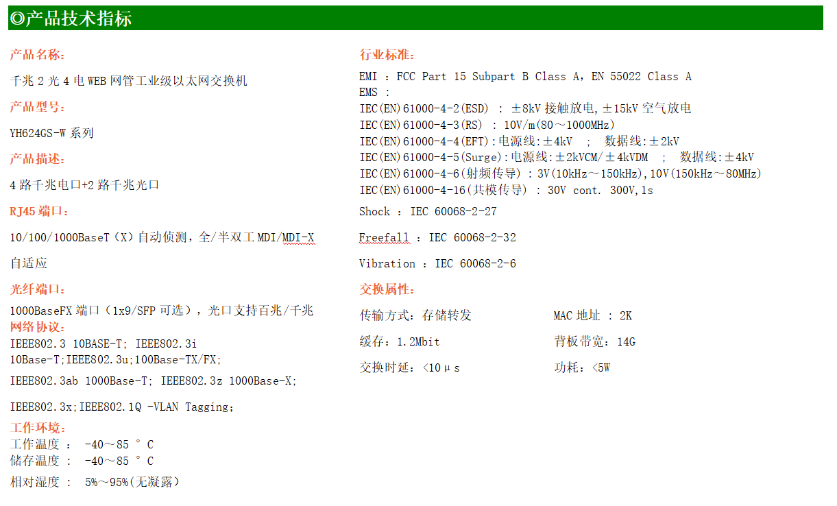 YH600-24GS-W系列WEB網管工業級以太網交換機,產品符合FCC、CE、ROHS標準,支持工業現場所需的以太網二層協議,保證通信網絡的穩定性。該系列交換機采用低功耗、無風扇設計,確保無噪聲干擾,同時支持-40~85℃工作溫度和良好的EMC電磁兼容性能,保證在惡劣的工業環境中保持穩定的工作,為工廠自動化,智能交通,視頻監控等工業應用領域組建快速穩定的網絡終端接入網絡提供安全可靠的解決方案。
