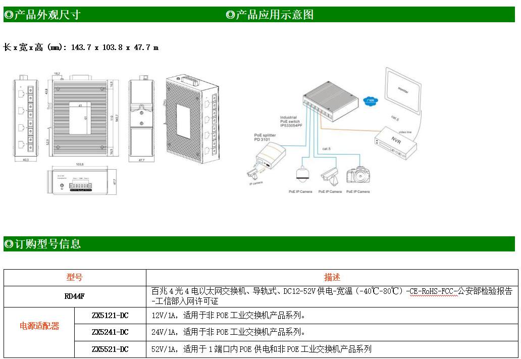 4路百兆電口+4路百兆光口工業(yè)級以太網(wǎng)交換機(jī),支持4個(gè)10Base-T/100Base-TX電口和4個(gè)100Base-SFP光口。產(chǎn)品符合FCC、CE、ROHS標(biāo)準(zhǔn)。RD44F交換機(jī)具有-40℃~80℃的工作溫度,具有超強(qiáng)的堅(jiān)固度能適應(yīng)各種嚴(yán)苛環(huán)境,也可以非常方便的安置在空間緊湊的控制箱中。導(dǎo)軌的安裝特性、寬溫操作及擁有IP40防護(hù)等級的外殼及LED指示燈,使RD44F成為一個(gè)即插即用的工業(yè)級設(shè)備,為用戶的以太網(wǎng)設(shè)備聯(lián)網(wǎng)提供可靠、便捷的解決方案。