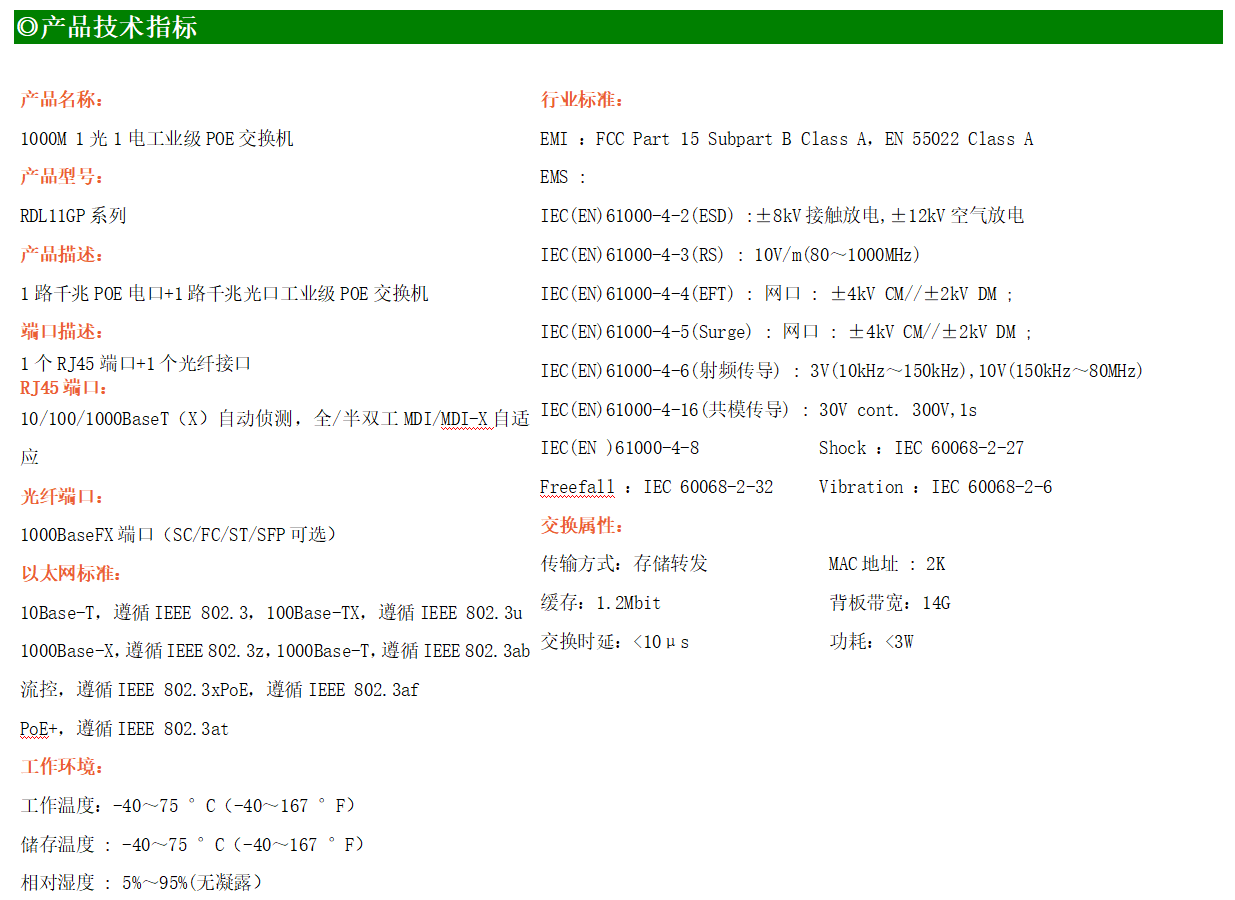 1路千兆POE電口+1路千兆FX光口工業(yè)級(jí)以太網(wǎng)POE交換機(jī),支持1個(gè)10/100Base-TX電口和1個(gè)100Base-X光口。產(chǎn)品符合FCC、CE、ROHS標(biāo)準(zhǔn)。RDL11GP系列交換機(jī)具有-40℃~75℃的工作溫度,具有超強(qiáng)的堅(jiān)固度能適應(yīng)各種嚴(yán)苛環(huán)境,也可以非常方便的安置在空間緊湊的控制箱中。導(dǎo)軌的安裝特性、寬溫操作及擁有IP40防護(hù)等級(jí)的外殼及LED指示燈,使RDL11GP成為一個(gè)即插即用的工業(yè)級(jí)設(shè)備,為用戶的以太網(wǎng)設(shè)備聯(lián)網(wǎng)提供可靠、便捷的解決方案。