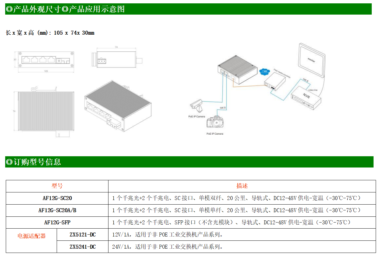 2路千兆電口+1路千兆FX光口工業(yè)級以太網(wǎng)交換機,支持2個100Base-T/1000Base-TX電口和1個1000Base-X光口。產(chǎn)品符合FCC、CE、ROHS標(biāo)準(zhǔn)。AF12G系列交換機具有-30℃~75℃的工作溫度,具有超強的堅固度能適應(yīng)各種嚴(yán)苛環(huán)境,也可以非常方便的安置在空間緊湊的控制箱中。導(dǎo)軌的安裝特性、寬溫操作及擁有IP40防護等級的外殼及LED指示燈,使AF12G成為一個即插即用的工業(yè)級設(shè)備,為用戶的以太網(wǎng)設(shè)備聯(lián)網(wǎng)提供可靠、便捷的解決方案。
