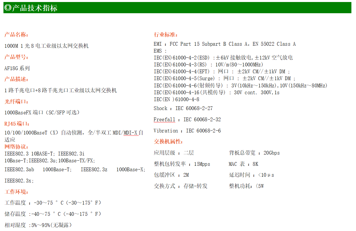8路千兆電口+1路千兆FX光口工業(yè)級(jí)以太網(wǎng)交換機(jī),支持8個(gè)100Base-T/1000Base-TX電口和1個(gè)1000Base-X光口。產(chǎn)品符合FCC、CE、ROHS標(biāo)準(zhǔn)。AF18G系列交換機(jī)具有-30℃~75℃的工作溫度,具有超強(qiáng)的堅(jiān)固度能適應(yīng)各種嚴(yán)苛環(huán)境,也可以非常方便的安置在空間緊湊的控制箱中。導(dǎo)軌的安裝特性、寬溫操作及擁有IP40防護(hù)等級(jí)的外殼及LED指示燈,使AF18G成為一個(gè)即插即用的工業(yè)級(jí)設(shè)備,為用戶的以太網(wǎng)設(shè)備聯(lián)網(wǎng)提供可靠、便捷的解決方案。