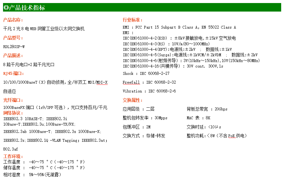 RDL28GS-W-SFP系列WEB網管工業(yè)級以太網交換機,產品符合FCC、CE、ROHS標準,支持工業(yè)現場所需的以太網二層協議,保證通信網絡的穩(wěn)定性。該系列交換機采用低功耗、無風扇設計,確保無噪聲干擾,同時支持-40~75℃工作溫度和良好的EMC電磁兼容性能,保證在惡劣的工業(yè)環(huán)境中保持穩(wěn)定的工作,為工廠自動化,智能交通,視頻監(jiān)控等工業(yè)應用領域組建快速穩(wěn)定的網絡終端接入網絡提供安全可靠的解決方案。