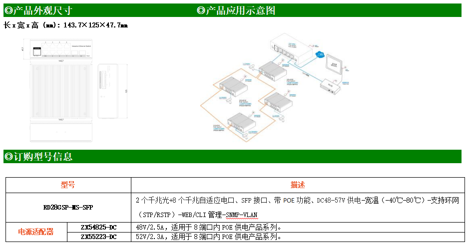 RD28GSP-MS是網管型工業以太網POE交換機,產品符合FCC、CE、RoHS標準。支持2個千兆光口和8個千兆電口;支持工業現場所需的以太網二層協議,保證通信網絡的穩定性;該系列交換機采用低功耗、無風扇設計,確保無噪聲干擾,同時支持-40~80℃工作溫度和良好的EMC電磁兼容性能,保證在惡劣的工業環境中保持穩定的工作,為工廠自動化,智能交通,視頻監控等工業應用領域組建快速穩定的網絡終端接入網絡提供安全可靠的解決方案。