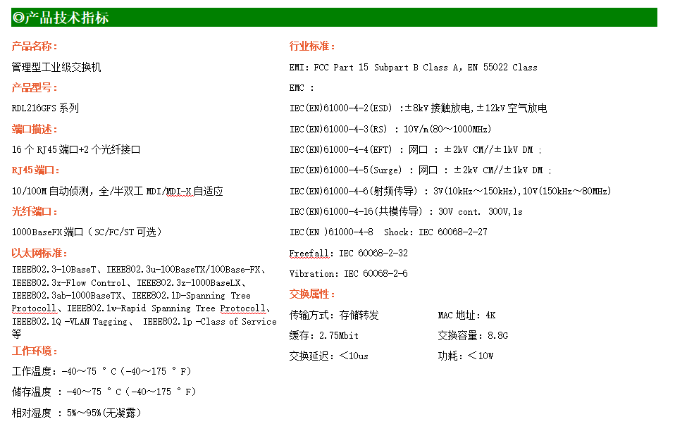 RDL216GFS系列網(wǎng)管型工業(yè)以太網(wǎng)交換機(jī),產(chǎn)品符合FCC、CE、ROHS標(biāo)準(zhǔn)。支持2個(gè)千兆光口和16個(gè)百兆電口,支持工業(yè)現(xiàn)場所需的以太網(wǎng)二層協(xié)議,保證通信網(wǎng)絡(luò)的穩(wěn)定性;該系列交換機(jī)采用低功耗、無風(fēng)扇設(shè)計(jì),確保無噪聲干擾,同時(shí)支持-40~75℃工作溫度和良好的EMC電磁兼容性能,保證在惡劣的工業(yè)環(huán)境中保持穩(wěn)定的工作,為工廠自動(dòng)化,智能交通,視頻監(jiān)控等工業(yè)應(yīng)用領(lǐng)域組建快速穩(wěn)定的網(wǎng)絡(luò)終端接入網(wǎng)絡(luò)提供安全可靠的解決方案。