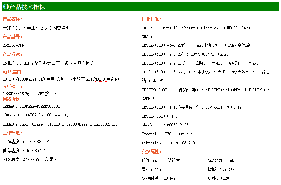 RD216G-SFP工業(yè)級以太網(wǎng)交換機,支持16個10Base-T/100Base-T/1000Base-TX電口和2個1000Base-X光口。產(chǎn)品符合FCC、CE、ROHS標準。RD216G-SFP交換機具有-40℃~80℃的工作溫度,具有超強的堅固度能適應各種嚴苛環(huán)境,也可以非常方便的安置在空間緊湊的控制箱中。導軌的安裝特性、寬溫操作及擁有IP40防護等級的外殼及LED指示燈,使RD216G-SFP成為一個即插即用的工業(yè)級設備,為用戶的以太網(wǎng)設備聯(lián)網(wǎng)提供可靠、便捷的解決方案。