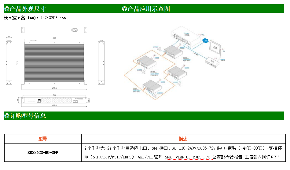RD224GSP-MU-SFP是網管型工業以太網PoE交換機,產品符合FCC、CE、RoHS標準。可提供24個千兆PoE端口,所有PoE端口符合IEEE802.3af/at標準。支持工業現場所需的以太網二層協議,保證通信網絡的穩定性;該系列交換機采用低功耗、無風扇設計,確保無噪聲干擾,同時支持-40~70℃工作溫度和良好的EMC電磁兼容性能,保證在惡劣的工業環境中保持穩定的工作,為工廠自動化,智能交通,視頻監控等工業應用領域組建快速穩定的網絡終端接入網絡提供安全可靠的解決方案