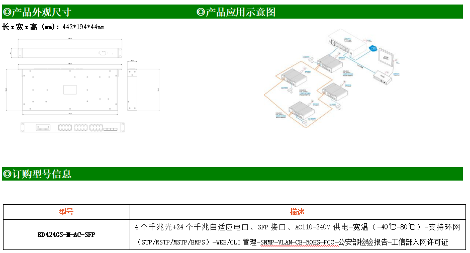 RD424GS-M-AC-SFP是網(wǎng)管型工業(yè)以太網(wǎng)交換機(jī),產(chǎn)品符合FCC、CE、RoHS標(biāo)準(zhǔn)。支持4個(gè)千兆光口和24個(gè)千兆電口;支持工業(yè)現(xiàn)場(chǎng)所需的以太網(wǎng)二層協(xié)議,保證通信網(wǎng)絡(luò)的穩(wěn)定性;該系列交換機(jī)采用低功耗、無(wú)風(fēng)扇設(shè)計(jì),確保無(wú)噪聲干擾,同時(shí)支持-40~80℃工作溫度和良好的EMC電磁兼容性能,保證在惡劣的工業(yè)環(huán)境中保持穩(wěn)定的工作,為工廠自動(dòng)化,智能交通,視頻監(jiān)控等工業(yè)應(yīng)用領(lǐng)域組建快速穩(wěn)定的網(wǎng)絡(luò)終端接入網(wǎng)絡(luò)提供安全可靠的解決方案。