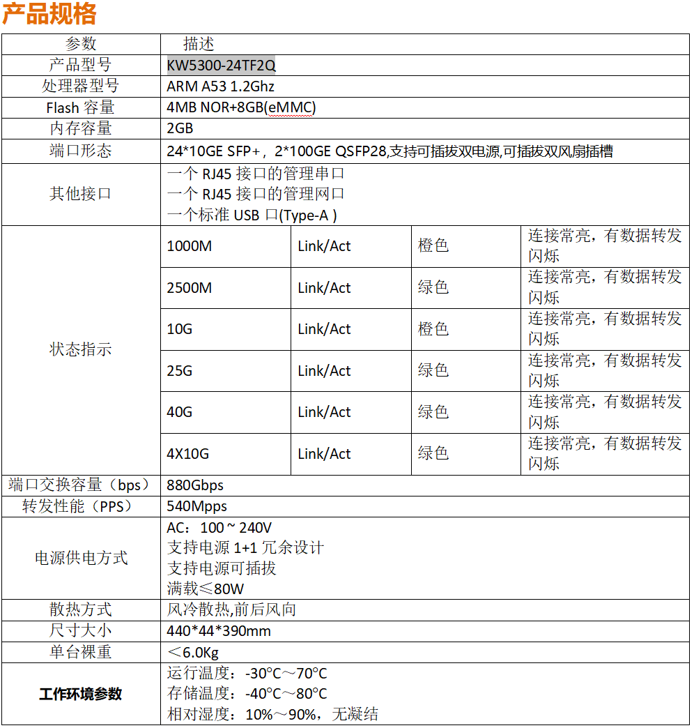 KW5300-24TF2Q是一款高性能萬兆核心交換機產品,可廣泛應用于運營商大型IP 城域網匯聚層或中小型城域網核心層、園區網企業網核心。整機設備提供大容量、高密度、模塊化的二/三層線速轉發性能,豐富的業務功能、強大的QoS 保障和完善的安全管理機制,具有電信級的可靠性設計,可以提供電源部件的冗余,保證網絡核心的穩定和關鍵業務的可靠運行;具有880G的交換容量,支持所有端口線速轉發。產品具有彈性堆疊功能,將多臺設備虛擬化成一臺邏輯實體,既能滿足端口和交換容量的擴容,又能實現多臺設備統一管理、升級、維護等需求。針對于數據中心數據流量大和無阻塞傳輸的要求,產品可以提供強大的緩存能力,并且支持先進的緩存調度機制可以保證設備緩存能力最大化的有效利用。旨在滿足下一代企業網、數據中心和城域網對于高密度高帶寬的網絡應用需求。可應用于網絡運營商或園區以太網匯聚層或接入層,也可作為數據中心接入層、中小企業核心層,并為數據中心提供豐富的服務器接入方案。