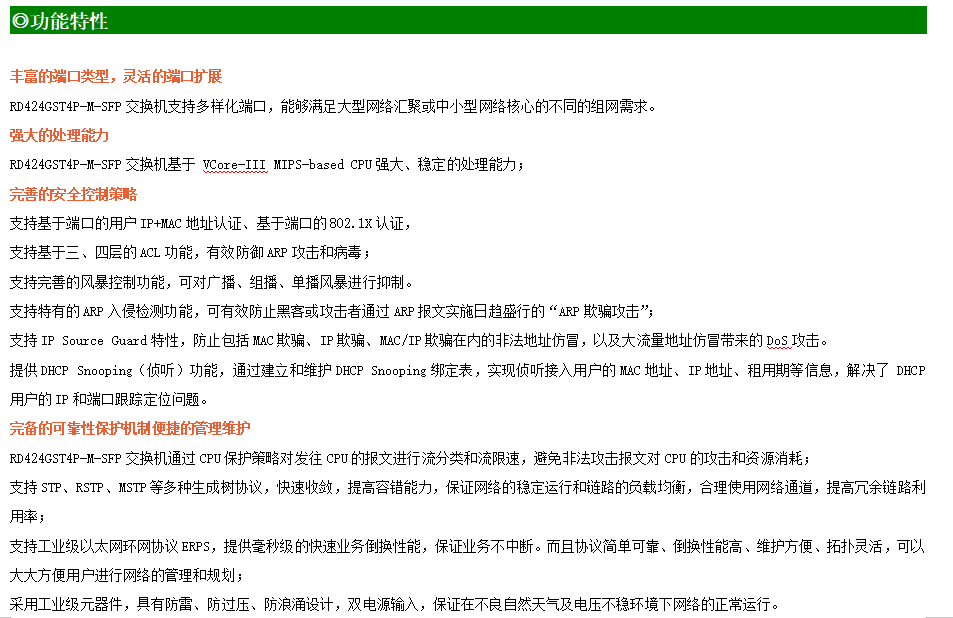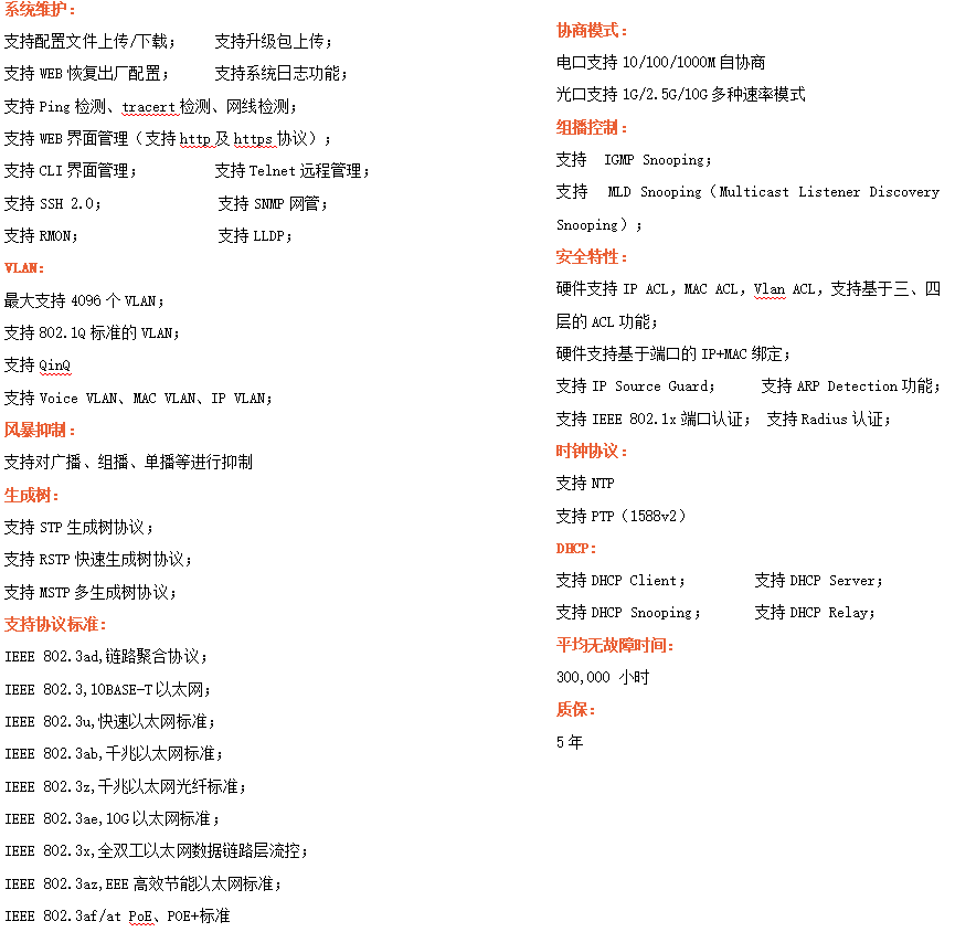 ●網(wǎng)絡(luò)冗余:支持STP/RSTP/MSTP,支持ERPS(自愈時(shí)間<20ms)