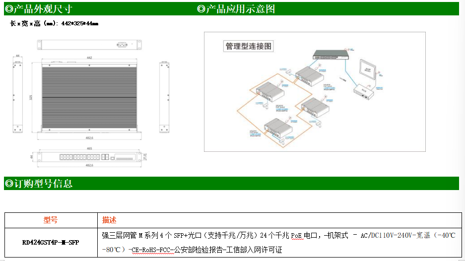 RD424GST4P-M-SFP交換機(jī)是我司推出的一款萬兆三層工業(yè)以太網(wǎng)交換機(jī),產(chǎn)品符合FCC、CE、RoHS標(biāo)準(zhǔn)。可提供24個(gè)千兆PoE端口,所有PoE端口符合IEEE802.3af/at標(biāo)準(zhǔn)。具備先進(jìn)的硬件處理能力和最豐富的業(yè)務(wù)特性。支持IPv4/IPv6 硬件雙棧及線速轉(zhuǎn)發(fā),使客戶能夠從容應(yīng)對即將帶來的IPv6 時(shí)代其提供高容量的交換能力。RD424GST4P-M-SFP交換機(jī)具有-40℃~80℃的工作溫度,具有超強(qiáng)的堅(jiān)固度能適應(yīng)各種嚴(yán)苛環(huán)境,使RD424GST4P-M-SFP的交換機(jī)成為一個(gè)即插即用的工業(yè)級設(shè)備,為用戶的以太網(wǎng)設(shè)備聯(lián)網(wǎng)提供可靠、便捷的解決方案。