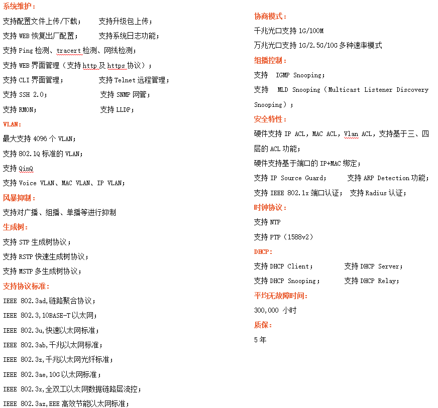 ●網絡冗余:支持STP/RSTP/MSTP,支持ERPS(自愈時間<20ms)