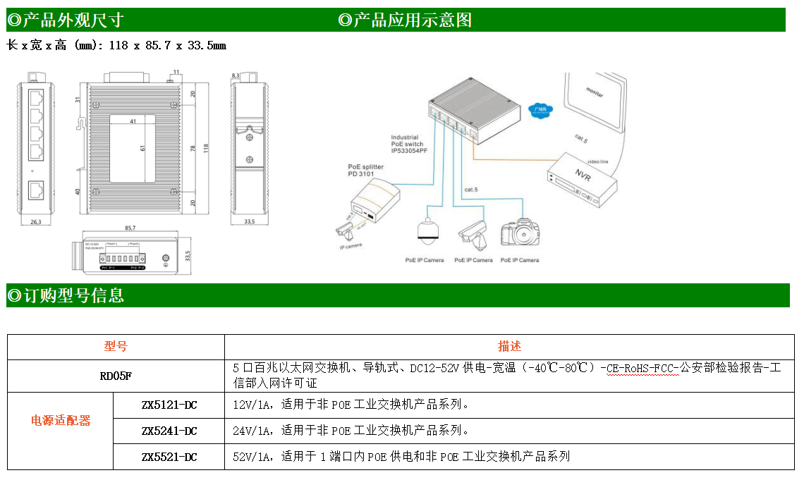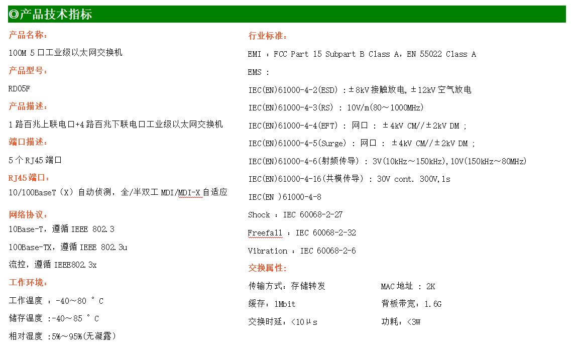 1路百兆上聯(lián)電口+4路百兆下聯(lián)電口工業(yè)級以太網(wǎng)交換機(jī),支持1個10/100Base-TX上聯(lián)電口和4個10Base-T/100Base-TX下聯(lián)電口。產(chǎn)品符合FCC、CE、ROHS標(biāo)準(zhǔn)。RD05F交換機(jī)具有-40℃~80℃的工作溫度,具有超強(qiáng)的堅固度能適應(yīng)各種嚴(yán)苛環(huán)境,也可以非常方便的安置在空間緊湊的控制箱中。導(dǎo)軌的安裝特性、寬溫操作及擁有IP40防護(hù)等級的外殼及LED指示燈,使RD05F成為一個即插即用的工業(yè)級設(shè)備,為用戶的以太網(wǎng)設(shè)備聯(lián)網(wǎng)提供可靠、便捷的解決方案。