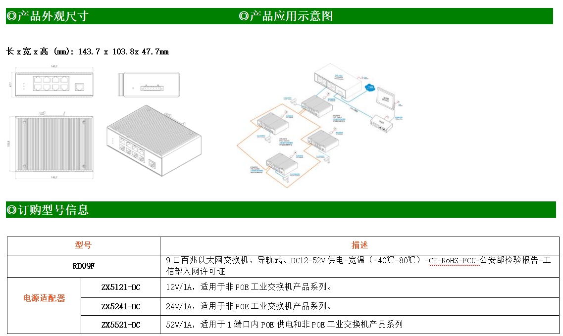 9路百兆電口工業(yè)級(jí)以太網(wǎng)交換機(jī),支持9個(gè)10Base-T/100Base-TX電口。產(chǎn)品符合FCC、CE、ROHS標(biāo)準(zhǔn)。RD09F交換機(jī)具有-40℃~80℃的工作溫度,具有超強(qiáng)的堅(jiān)固度能適應(yīng)各種嚴(yán)苛環(huán)境,也可以非常方便的安置在空間緊湊的控制箱中。導(dǎo)軌的安裝特性、寬溫操作及擁有IP40防護(hù)等級(jí)的外殼及LED指示燈,使RD09F成為一個(gè)即插即用的工業(yè)級(jí)設(shè)備,為用戶的以太網(wǎng)設(shè)備聯(lián)網(wǎng)提供可靠、便捷的解決方案。