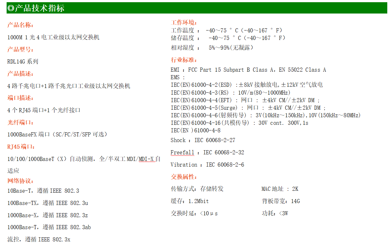 4路千兆電口+1路千兆FX光口工業級以太網交換機,支持4個100Base-T/1000Base-TX電口和1個1000Base-X光口。產品符合FCC、CE、ROHS標準。RDL14G系列交換機具有-40℃~75℃的工作溫度,具有超強的堅固度能適應各種嚴苛環境,也可以非常方便的安置在空間緊湊的控制箱中。導軌的安裝特性、寬溫操作及擁有IP40防護等級的外殼及LED指示燈,使RDL14G系列成為一個即插即用的工業級設備,為用戶的以太網設備聯網提供可靠、便捷的解決方案。