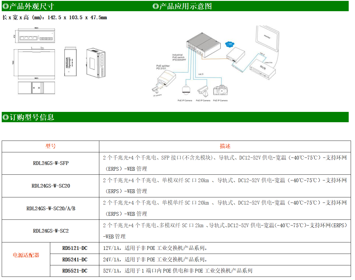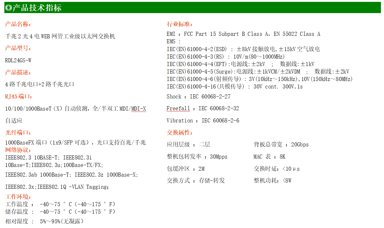 RDL24GS-W-SFP系列WEB網(wǎng)管工業(yè)級(jí)以太網(wǎng)交換機(jī),產(chǎn)品符合FCC、CE、ROHS標(biāo)準(zhǔn),支持工業(yè)現(xiàn)場(chǎng)所需的以太網(wǎng)二層協(xié)議,保證通信網(wǎng)絡(luò)的穩(wěn)定性。該系列交換機(jī)采用低功耗、無(wú)風(fēng)扇設(shè)計(jì),確保無(wú)噪聲干擾,同時(shí)支持-40~75℃工作溫度和良好的EMC電磁兼容性能,保證在惡劣的工業(yè)環(huán)境中保持穩(wěn)定的工作,為工廠自動(dòng)化,智能交通,視頻監(jiān)控等工業(yè)應(yīng)用領(lǐng)域組建快速穩(wěn)定的網(wǎng)絡(luò)終端接入網(wǎng)絡(luò)提供安全可靠的解決方案。