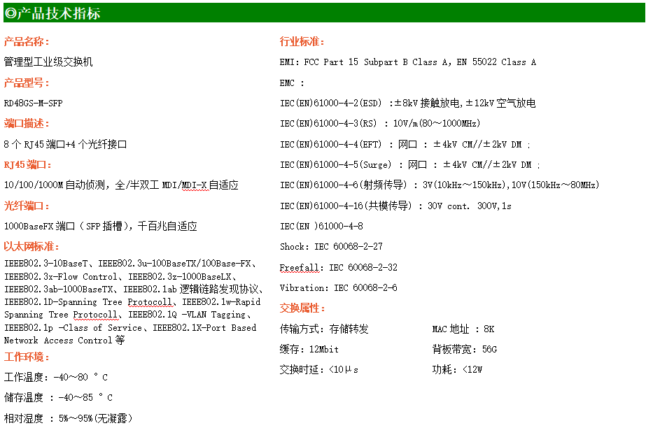RD48GS-M-SFP是網(wǎng)管型工業(yè)以太網(wǎng)交換機,產(chǎn)品支持4個千兆光口和8個千兆電口;支持工業(yè)現(xiàn)場所需的以太網(wǎng)二層協(xié)議,保證通信網(wǎng)絡(luò)的穩(wěn)定性;該系列交換機采用低功耗、無風(fēng)扇設(shè)計,確保無噪聲干擾,同時支持-40~80℃工作溫度和良好的EMC電磁兼容性能,保證在惡劣的工業(yè)環(huán)境中保持穩(wěn)定的工作,為工廠自動化,智能交通,視頻監(jiān)控等工業(yè)應(yīng)用領(lǐng)域組建快速穩(wěn)定的網(wǎng)絡(luò)終端接入網(wǎng)絡(luò)提供安全可靠的解決方案。