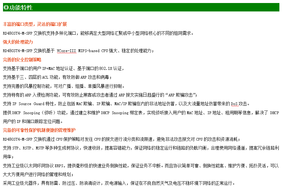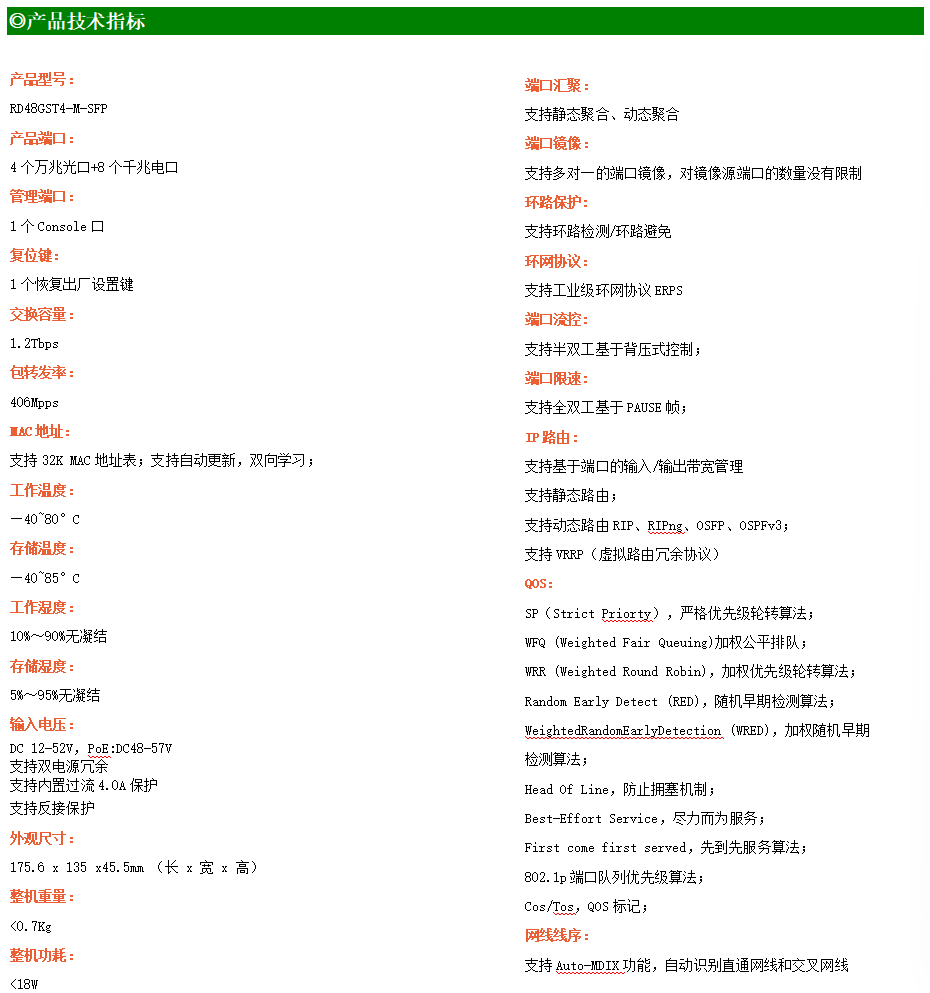 ●網絡冗余:支持STP/RSTP/MSTP,支持ERPS(自愈時間<20ms)