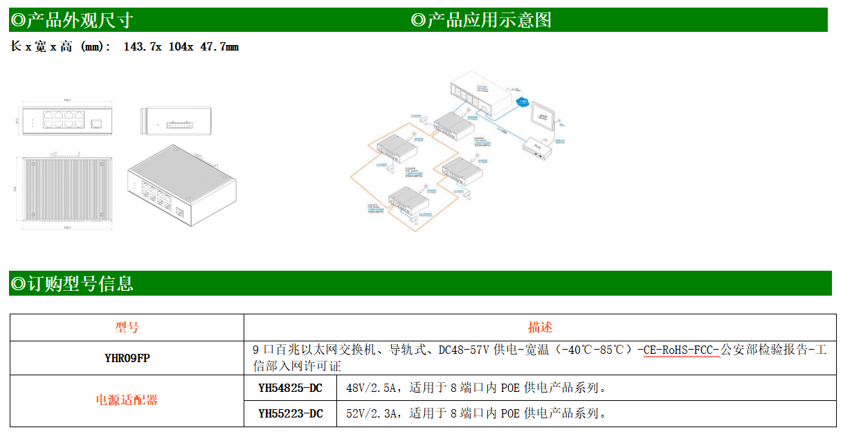 9路百兆電口工業(yè)級(jí)以太網(wǎng)交換機(jī),支持9個(gè)10Base-T/100Base-TX電口。產(chǎn)品符合FCC、CE、ROHS標(biāo)準(zhǔn)。YH200-09FP交換機(jī)具有-40℃~85℃的工作溫度,具有超強(qiáng)的堅(jiān)固度能適應(yīng)各種嚴(yán)苛環(huán)境,也可以非常方便的安置在空間緊湊的控制箱中。導(dǎo)軌的安裝特性、寬溫操作及擁有IP40防護(hù)等級(jí)的外殼及LED指示燈,使YHR09FP成為一個(gè)即插即用的工業(yè)級(jí)設(shè)備,為用戶的以太網(wǎng)設(shè)備聯(lián)網(wǎng)提供可靠、便捷的解決方案。