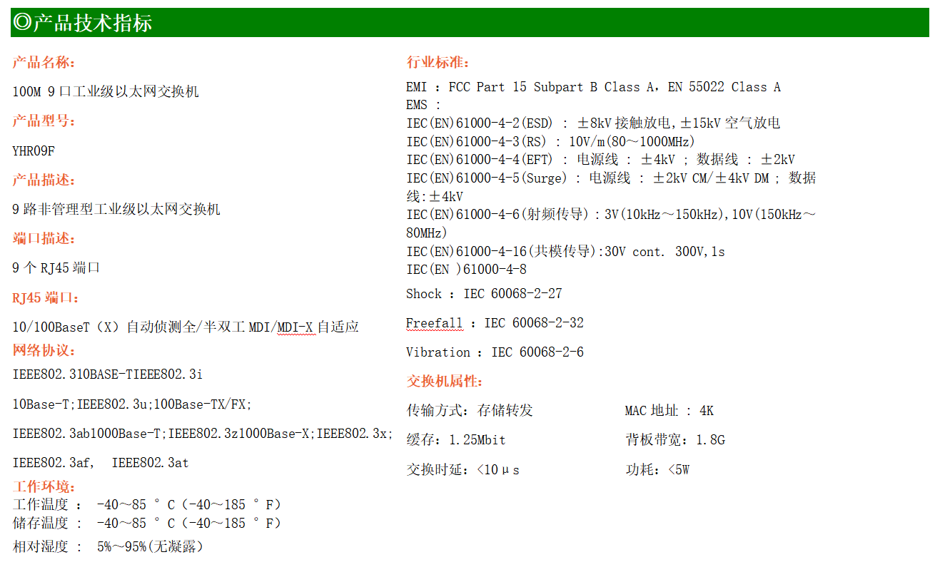 9路百兆電口工業級以太網交換機,支持9個10Base-T/100Base-TX電口。產品符合FCC、CE、ROHS標準。YHR09F交換機具有-40℃~85℃的工作溫度,具有超強的堅固度能適應各種嚴苛環境,也可以非常方便的安置在空間緊湊的控制箱中。導軌的安裝特性、寬溫操作及擁有IP40防護等級的外殼及LED指示燈,使YH200-09F成為一個即插即用的工業級設備,為用戶的以太網設備聯網提供可靠、便捷的解決方案。