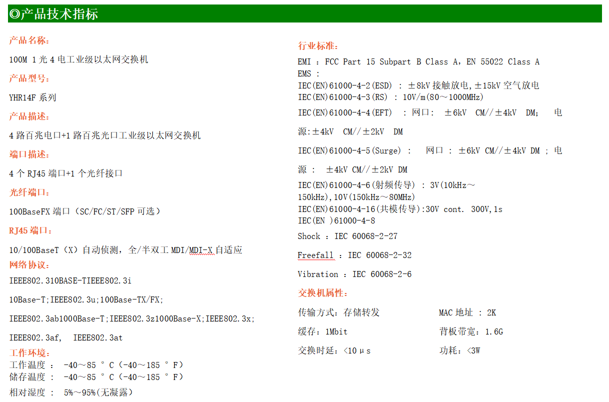 4路百兆電口+1路百兆FX光口工業級以太網交換機,支持4個10Base-T/100Base-TX電口和1個100Base-X光口。產品符合FCC、CE、ROHS標準。YHR14F系列交換機具有-40℃~85℃的工作溫度,具有超強的堅固度能適應各種嚴苛環境,也可以非常方便的安置在空間緊湊的控制箱中。導軌的安裝特性、寬溫操作及擁有IP40防護等級的外殼及LED指示燈,使YH200-14F成為一個即插即用的工業級設備,為用戶的以太網設備聯網提供可靠、便捷的解決方案。