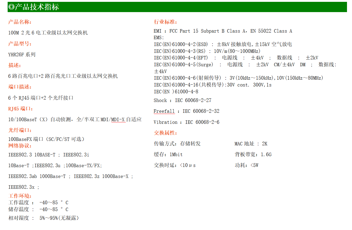 6路百兆電口+2路百兆FX光口工業級以太網交換機,支持6個10Base-T/100Base-TX電口和2個100Base-X光口。產品符合FCC、CE、ROHS標準。YH200-26F系列交換機具有-40℃~85℃的工作溫度,具有超強的堅固度能適應各種嚴苛環境,也可以非常方便的安置在空間緊湊的控制箱中。導軌的安裝特性、寬溫操作及擁有IP40防護等級的外殼及LED指示燈,使YH200-26F成為一個即插即用的工業級設備,為用戶的以太網設備聯網提供可靠、便捷的解決方案。