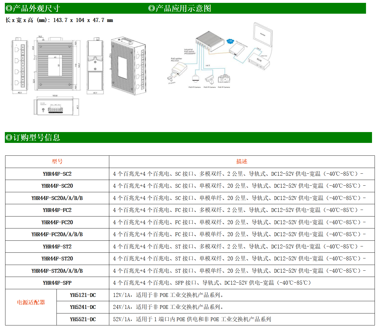 4路百兆電口+4路百兆FX光口工業(yè)級以太網(wǎng)交換機(jī),支持4個10Base-T/100Base-TX電口和4個100Base-X光口。產(chǎn)品符合FCC、CE、ROHS標(biāo)準(zhǔn)。YH200-44F系列交換機(jī)具有-40℃~85℃的工作溫度,具有超強(qiáng)的堅(jiān)固度能適應(yīng)各種嚴(yán)苛環(huán)境,也可以非常方便的安置在空間緊湊的控制箱中。導(dǎo)軌的安裝特性、寬溫操作及擁有IP40防護(hù)等級的外殼及LED指示燈,使YH200-44F成為一個即插即用的工業(yè)級設(shè)備,為用戶的以太網(wǎng)設(shè)備聯(lián)網(wǎng)提供可靠、便捷的解決方案。